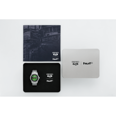 Orologio Seiko in collaborazione con il noto marchio di abbigliamento streetwear "HUF" un marchio fondato nel 2002 dallo skateboarder professionista Keith Hufnagel. Il Seiko SRPM09K1 ha un Quadrante verde trasparente che prende ispirazione da un orologio Seiko degli anni 70 il mitico "Time Sonar".