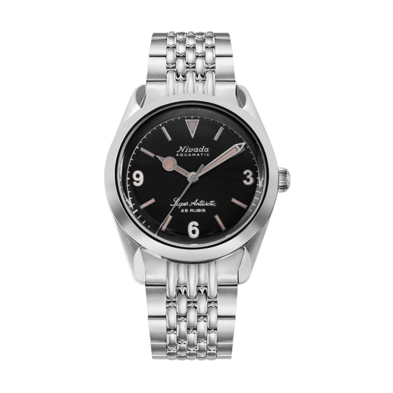 Orologio Nivada Grenchen super antarctic 3.6.9 con quadrante nero e lancette e indici effetto vintage, diametro cassa 38 mm. vetro zaffiro, movimento automatico con 28800 alternanze ora. Bracciale in acciaio maglia chicchi di riso.