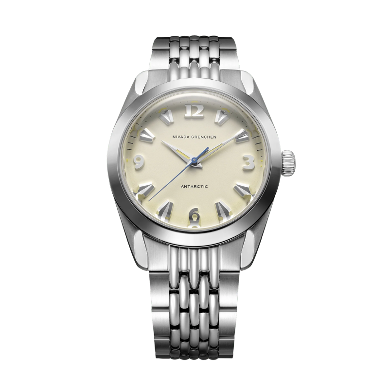 Nivada Antarctic diametro 38 mm. con quadrante guscio d'uovo e indici applicati luminova beige con movimento automatico Svizzero Soprod P024 con 28800 alternanze ora, vetro bombato zaffiro con trattamento antiriflesso interno, resistente all'acqua 100 metri, fondello chiuso a vite con impresso medaglione della spedizione nell'antartico, bracciale in acciaio maglia a chicchi di riso.