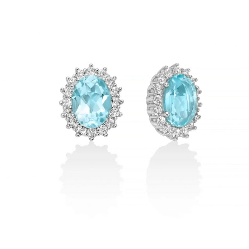 Orecchini Miluna in argento 925 con due topazi azzurri naturali taglio ovale di carati 2,98 complessivi, dimensioni 8 per 6 millimetri, impreziositi da 32 topazi bianchi naturali taglio rotondo punti totali 0,64.