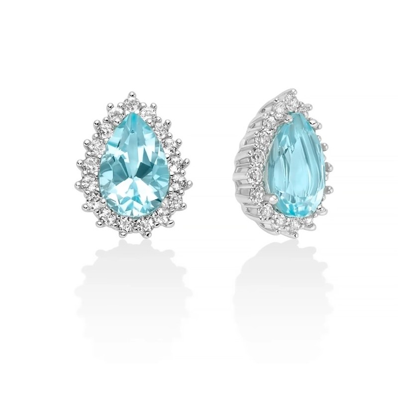 Orecchini Miluna in argento 925 con due topazi azzurri naturali taglio goccia di carati 3,06 complessivi, dimensioni 9 per 6 millimetri, impreziositi da 34 topazi bianchi naturali taglio rotondo punti totali 0,68.
