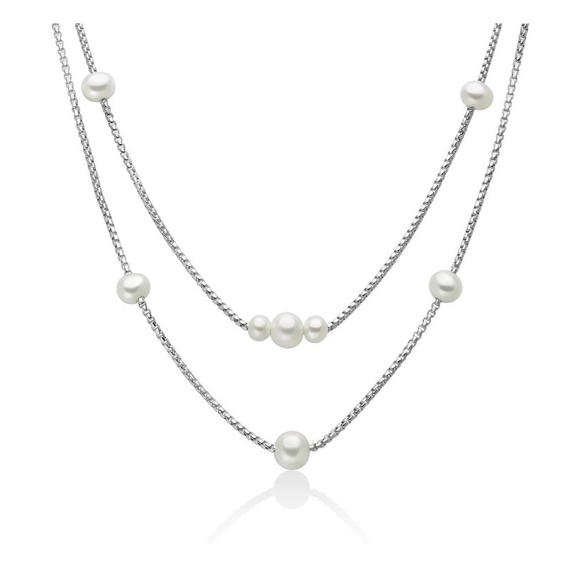 Miluna girocollo doppio filo in argento 925/1000 e 4 perle vere Oriente bianche di dimensione 5-5,5 mm, 4 perle vere Oriente bianche di 6-6,5mm e 2 perle vere Oriente bianche di 7-7,5mm.