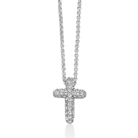 Collana in argento 925/1000 collezione Giochi di luce con croce resa luminosa da 43 topazi naturali bianchi taglio rotondo di 0,43 ct totali. La catenina si regola da 40 a 45 centimetri grazie agli anellini posti in chiusura.