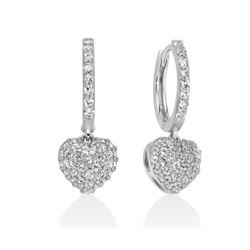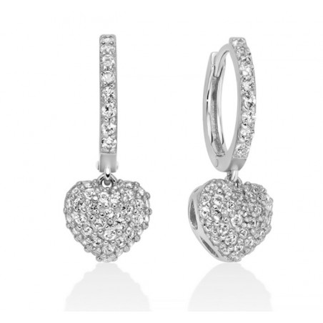 Orecchini in argento 925/1000 collezione Giochi di luce, a cerchio, con cuori grandi pendenti impreziositi da 82 topazi bianchi naturali taglio rotondo di carati totali pari a 0,90. Se desideri un paio di orecchini che siano luminosi e romantici, questo modello Miluna è la scelta migliore.