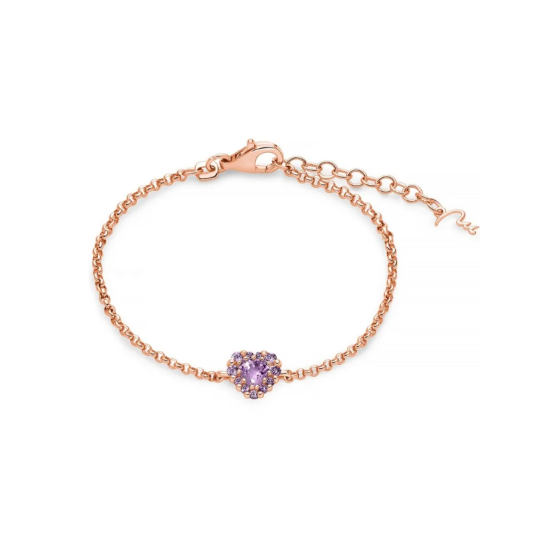 Bracciale in argento 925/1000 placcato oro rosa, collezione gemma del cielo con ametista viola naturale di forma cuore di carati 0,40 e 7 ametiste naturali viola taglio rotondo di caratura complessiva pari a 0,14.La lunghezza è regolabile grazie agli anellini posti in chiusura.