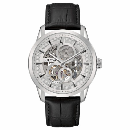 Orologio Bulova della Collezione Scheleton dal quadrante con Movimento Automatico a vista, fondello a vista, cassa in acciaio, 43mm di diametro, impermeabile fino a 3 BAR, vetro minerale, cinturino in pelle con chiusura deployante.