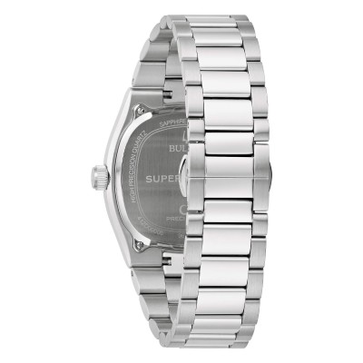 Bulova 96B439 Super Seville quadrante verde, cassa diametro 38 mm. in acciaio con lunetta zigrinata, vetro zaffiro e bracciale in acciaio integrato, movimento quarzo precisionist ad alta frequenza.