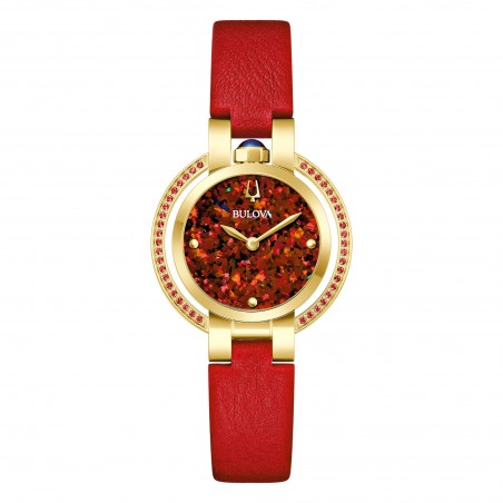 Orologio Bulova 97R105 Rubaiyat collezione four seasons dedicato alla stagione Autunno con quadrante in opale rosso e 42 rubini incastonati nella lunetta a cornice del quadrante, cassa in acciaio trattata IP oro giallo del diametro di 30 mm. con vetro zaffiro.