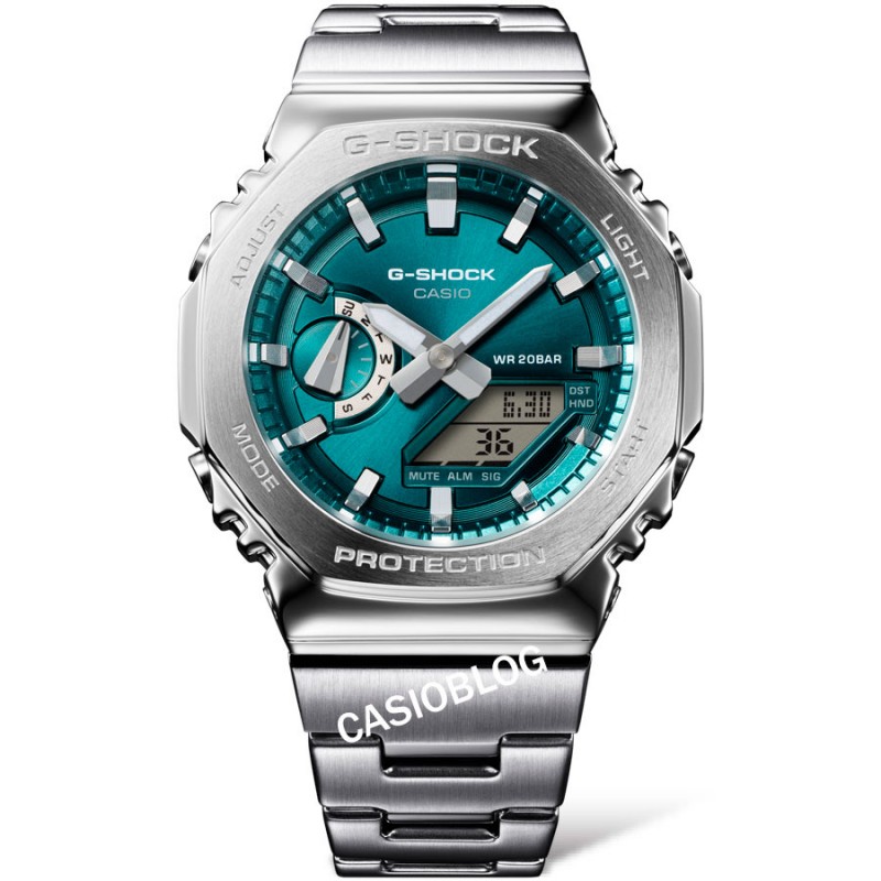 Casio G-Shock dalla forma ottagonale con bracciale in acciaio, quadrante verde smeraldo digitale e analogico, impermeabile 200 metri, orologio muti funzioni : suoneria, cronografo, ora e data.