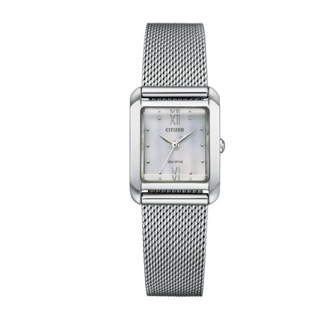 Citizen EW5990-62A collezione Lady in acciaio rettangolare dimensioni diametro 21,5 mm. con movimento eco-drive solare con 6 mesi di riserva di carica, bracciale in acciaio maglia mesh e cinturino in pelle azzurro intercambiabile, vetro zaffiro, resistente all'acqua 5 bar.