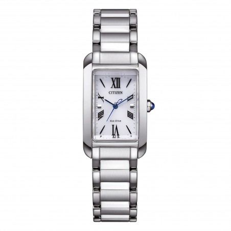 Orologio Citizen da donna di forma rettangolare con quadrante bianco e numeri romani, eco-drive a carica luce infinita, vetro zaffiro e bracciale in acciaio con chiusura a farfalla a scomparsa.