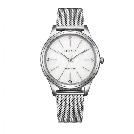 Citizen EM1220-82A da donna con tecnologia eco-drive a carica solare con riserva di carica di 6 mesi, diametro cassa 34 mm. quadrante bianco, bracciale mesh in acciaio, resistente all'acqua 5 bar.