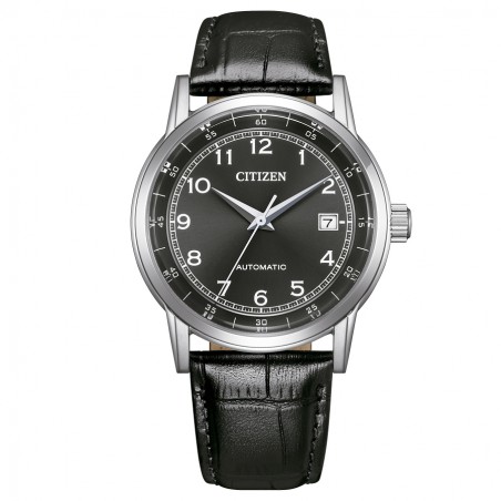 Citizen NJ0210-05E Automatico con cassa in acciaio diametro 40 mm. quadrante nero con numeri arabi e cinturino in pelle, movimento calibro Citizen 8210 meccanico automatico con 42 ore di riserva di carica.