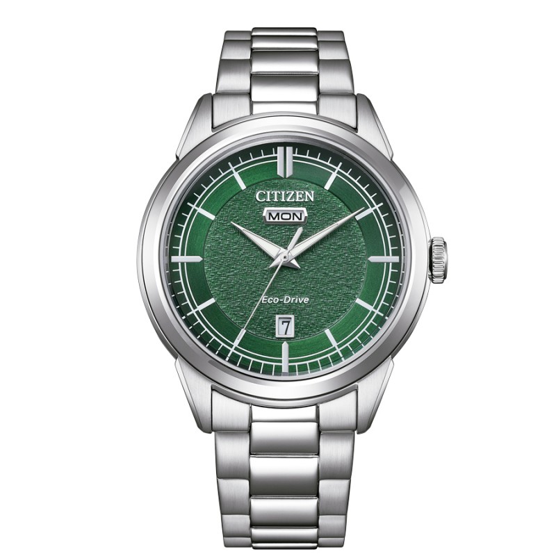 Citizen AW0151-85X eco-drive solare calibro J800 con 8 mesi di riserva di carica, diametro cassa 40,5 mm. quadrante verde lavorato con giorno e data, bracciale in acciaio, resistente all'acqua 10 bar.