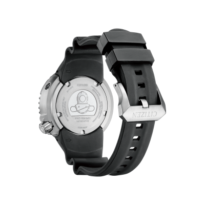 Orologio Citizen BN1024-01E Diver 300 metri quadrante nero che si ispira alle tonalità scure delle profondità marine con una transizione di colore più profonda verso la posizione delle ore 6 e movimento eco-drive solare con riserva di carica di 365 giorni, fondello a vite con serigrafia del palombaro, ghiera girevole unidirezionale, valvola elio, vetro zaffiro e cinturino realizzato con Benebiol un poliuretano di origine vegetale.