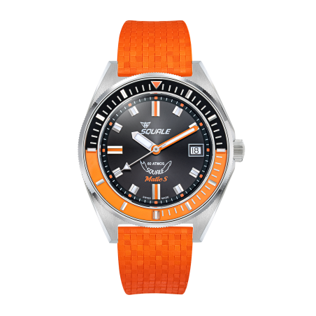 Squale MATICBKOBK.MROR Matic S diametro cassa 39,5 mm. lug to lug 47 mm. con cinturino in gomma arancione mosaico, quadrante nero con inserti arancioni e ghiera girevole unidirezionale con inserto arancione e nero, movimento automatico Sellita SW200-1 grado elaborè con 42 ore di riserva di carica. Vetro zaffiro bombato con trattamento antiriflesso, resistente all'acqua 600 metri diver professionale, quadrante nero sunray con indici applicati trattati con superluminova C3.