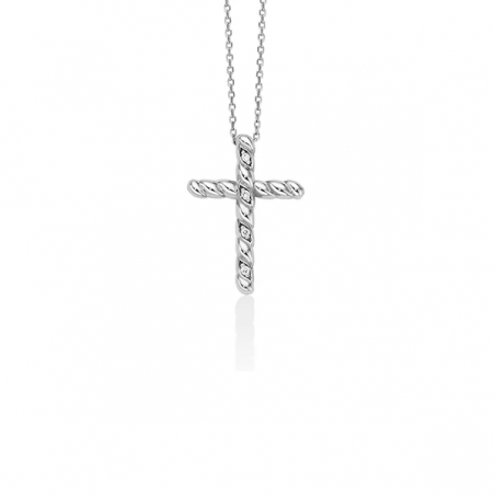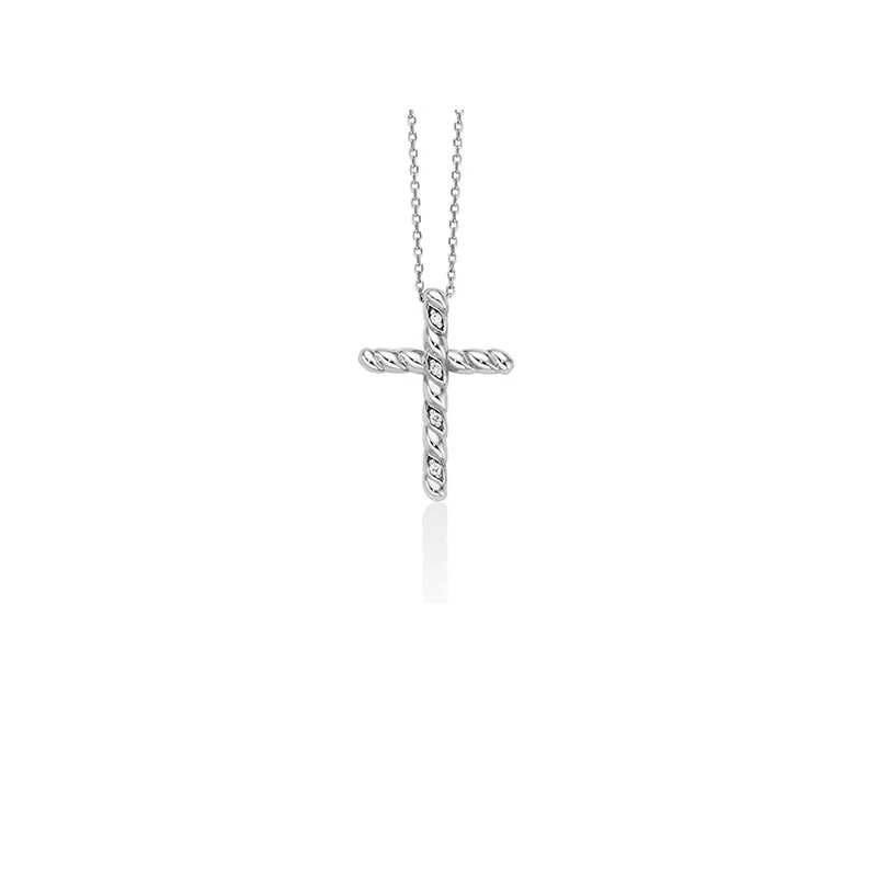 Girocollo Miluna della collezione 375 realizzato in oro bianco con croce, i 4 diamanti incastonati sono di caratura 1,12 punti complessivi, colore G purezza SI. La dimensione è di 1,6cm.