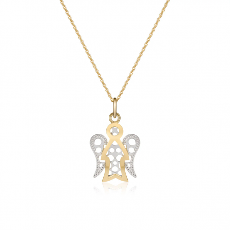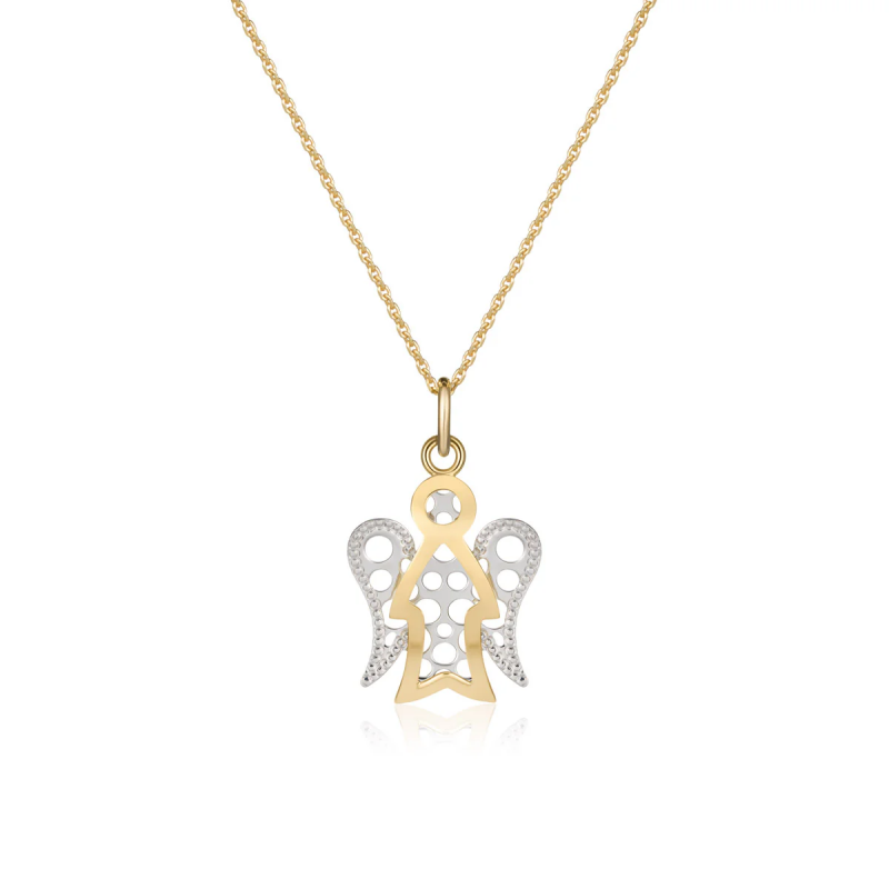 Collana in oro 375 con angelo bicolore in giallo e bianco, catenina lunghezza 40 / 42 cm. dimensione angelo: base 1 cm. altezza 1,4 cm. consegnata con tutto il suo corredo per fare una confezione impeccabile e garanzia di autenticità.