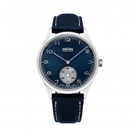 Orologio Vulcain Grand Prix piccoli secondi edizione limitata di soli 25 pezzi al mondo numerati, quadrante blu soleil contatore secondina a ore 6 silver, numeri arabi applicati, vetro zaffiro bombato con trattamento antiriflesso esterno, cinturino in pelle blu, movimento automatico Svizzero Landeron L24 a 28800 alternanze ora con riserva di carica 40 ore, diametro cassa 39 mm.