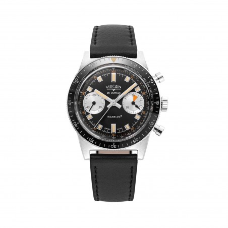 Orologio Vulcain skindiver Chrono quadrante nero e contatori bianchi (reverse panda) diametro cassa 39 mm. resistente all'acqua 300 metri movimento automatico Valjoux ETA 7753 con 28800 alternanze ora, ghiera girevole con inserto in ceramica nero, cassa in acciaio con finitura lucida e satinata, indici trattati con luminova beige kakhi old radium cinturino in pelle con chiusura ad ardiglione e sgancio rapido.