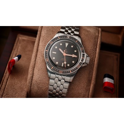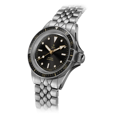Yema Superman Gilt con movimento di manifattura CMM.10 visibile attraverso il fondello in zaffiro trasparente che garantisce ben 70 ore di riserva di carica e bracciale a squama di pesce, diametro cassa 39 mm. quadrante nero sunray con inserti dorati, ghiera girevole unidirezionale con sistema di blocco di sicurezza brevettato da Yema, Garanzia ufficiale Yema 5 anni, vetro zaffiro antiriflesso, impermeabile 300 metri.